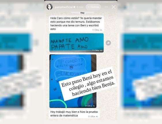 La modelo posteó una historia con una conversación con uno de los profesores de Benicio, el hijo menor que comparte con el chileno: "Hola Caro, cómo estás? Te quería mandar esto porque me dio ternura. Estábamos haciendo una tarea con Beni y escribió esto".