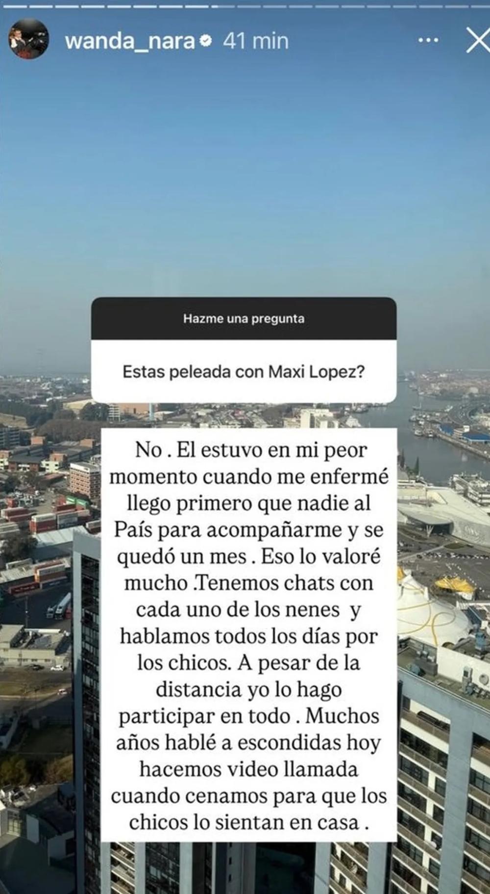 Wanda Nara abrió su corazón en las redes sociales y sorprendió al referirse al rol que tuvo Maxi López durante uno de los momentos más delicados de su vida. La empresaria, que desde hace meses comparte detalles sobre su estado de salud, respondió preguntas de sus seguidores en Instagram y habló con sinceridad sobre sus exparejas: Mauro Icardi, L-Gante y también López, con quien tiene tres hijos en común: Valentino, Constantino y Benedicto.