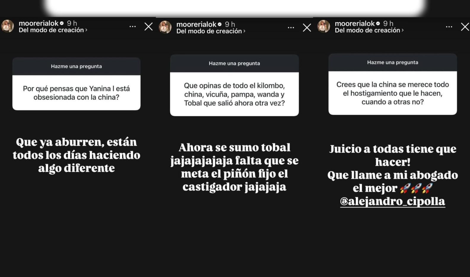 "Juicio a todas tiene que hacer. Que llame a mi abogado, el mejor: Alejandro Cipolla", escribió sin vueltas, sugiriendo acciones legales contra quienes la critican.