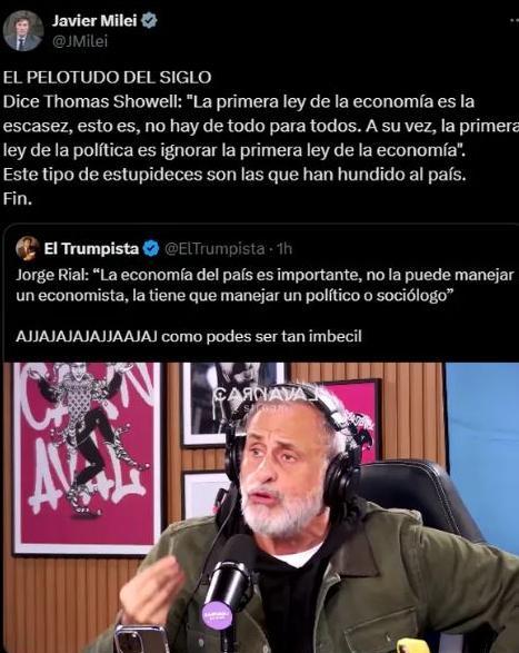 Fiel a su estilo combativo en redes, el Presidente reaccionó sin filtro. Citó el comentario de Rial y lo calificó como: "EL PELO... DEL SIGLO". Luego, sumó una frase del economista Thomas Sowell para reforzar su postura:
