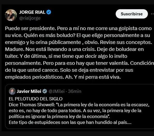 Nuevo cruce entre Jorge Rial y Javier Milei encendió la polémica en redes Nuevo cruce entre Jorge Rial y Javier Milei encendió la polémica en redes