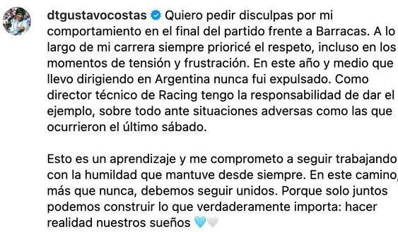 "Quiero pedir disculpas por mi comportamiento en el final del partido frente a Barracas. A lo largo de mi carrera siempre prioricé el respeto, incluso en los momentos de tensión y frustración. En este año y medio que llevo dirigiendo en Argentina nunca fui expulsado", escribió el DT, acompañando el texto con una imagen suya en el Cilindro.