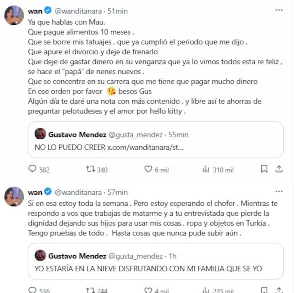 "Ya que hablas con Mau, que pague alimentos 10 meses. Que se borre mis tatuajes, que ya cumplió el periodo que me dijo. Que apure el divorcio y deje de frenarlo", escribió. Y sin filtros lanzó: "Que deje de gastar dinero en su venganza que ya lo vimos todos está re feliz, se hace el 'papá' de nenes nuevos".