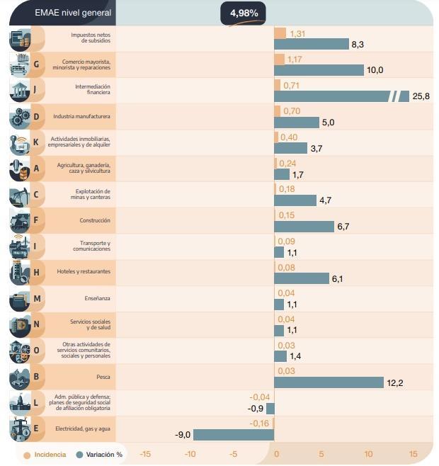 Con relación a igual mes de 2024, trece de los sectores de actividad que conforman el EMAE registraron subas en mayo, entre los que se destacan Intermediación financiera (25,8% ia) y Pesca (12,2% ia).