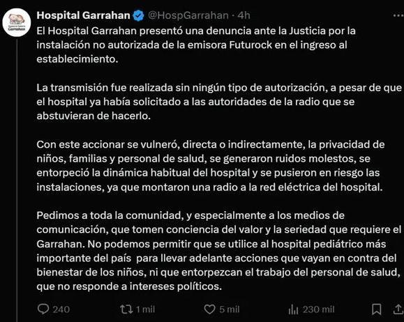Además, desmintieron que la radio haya afectado la atención a pacientes: "Futurock informó desde la entrada exclusiva del personal, sin interferir en la atención ni en el funcionamiento del hospital", remarcaron.