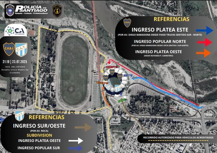 Platea Oeste y Popular Sur: acceso conjunto por sur/oeste Avenida Roca, con señalización para cada sector.