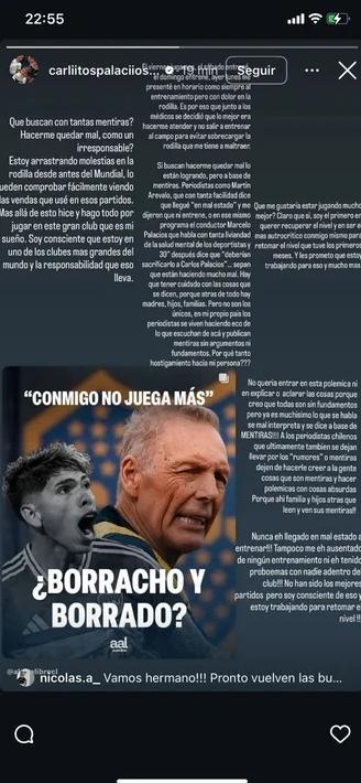 El mediocampista chileno de Boca, Carlos Palacios, rompió el silencio en redes sociales luego de no ser convocado por Miguel Ángel Russo para el partido de este miércoles frente a Atlético Tucumán, y desmintió los rumores que sostenían que llegó en estado de embriaguez al entrenamiento del lunes.