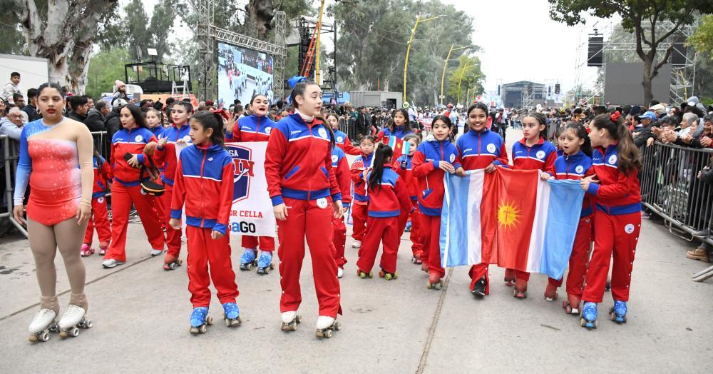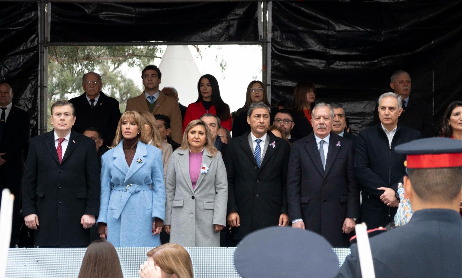Estuvo acompañado en el palco por el vicegobernador Carlos Silva Neder; la senadora Claudia de Zamora; el jefe de Gabinete, Elías Suárez, la intendente Norma Fuentes y otras autoridades, más de 170 instituciones intermedias, fuerzas de seguridad, colectividades de inmigrantes, clubes de autos y motos y agrupaciones gauchas pusieron en escena un imponente despliegue.