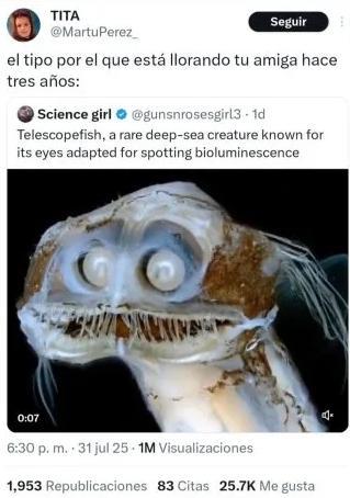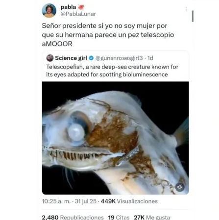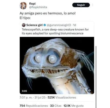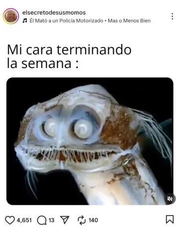 En paralelo al interés científico, el pez telescopio desató una ola de humor en redes sociales. Usuarios y páginas de memes compartieron imágenes de la criatura con frases como "mi cara terminando la semana" o "cuando veo el resumen del banco un lunes". La cuenta de Instagram El secreto de sus momos, con casi 900 mil seguidores, fue una de las más activas con contenidos sobre el pez.