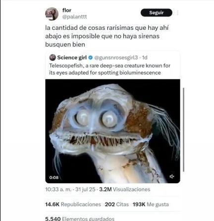 Aunque no apareció durante la transmisión en vivo del Consejo Nacional de Investigaciones Científicas y Técnicas, este peculiar pez del género Gigantura se viralizó rápidamente por su aspecto fuera de lo común: ojos enormes, boca amplia y cuerpo brillante. Las redes no tardaron en hacer lo suyo, y los memes inundaron Instagram, X (ex Twitter) y TikTok.