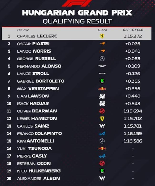 En esta primera instancia, el más rápido fue Oscar Piastri (McLaren) con un sólido 1m15s211, mientras que quedaron eliminados nombres importantes como Yuki Tsunoda (Red Bull), Pierre Gasly (Alpine) quedó a solo 91 milésimas del argentino, Esteban Ocon (Haas), Nico Hülkenberg (Sauber) y Alexander Albon (Williams).