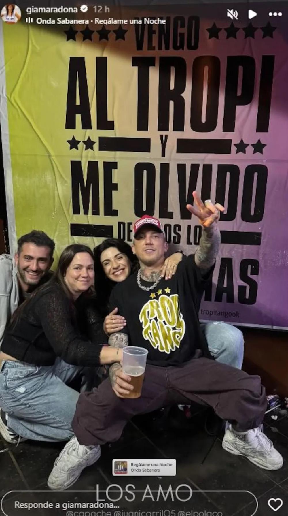 Luego, en una segunda foto se mostraron junto a sus amigos, pero no pasó desapercibido el abrazo de Gianinna al músico. El grupo está sentado en el piso, y atrás hay un cartel del local bailable que dice: "Vengo al Tropi y me olvido de los problemas".