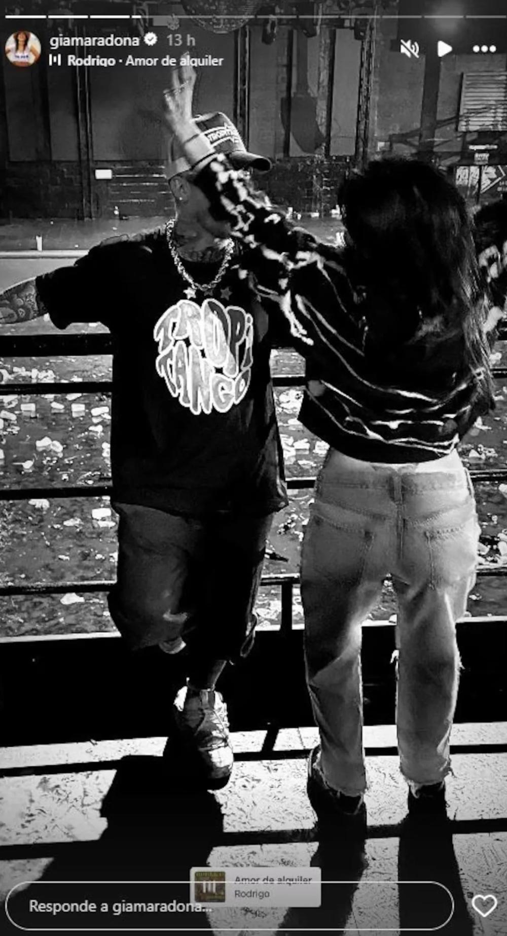 En la imagen que subió la hija del Diez, el brazo de ella le cubre media cara al cantante, que está de frente a la cámara, mientras ella está de espaldas, como bailando. Además, eligió de fondo el tema Amor de alquiler de Rodrigo.