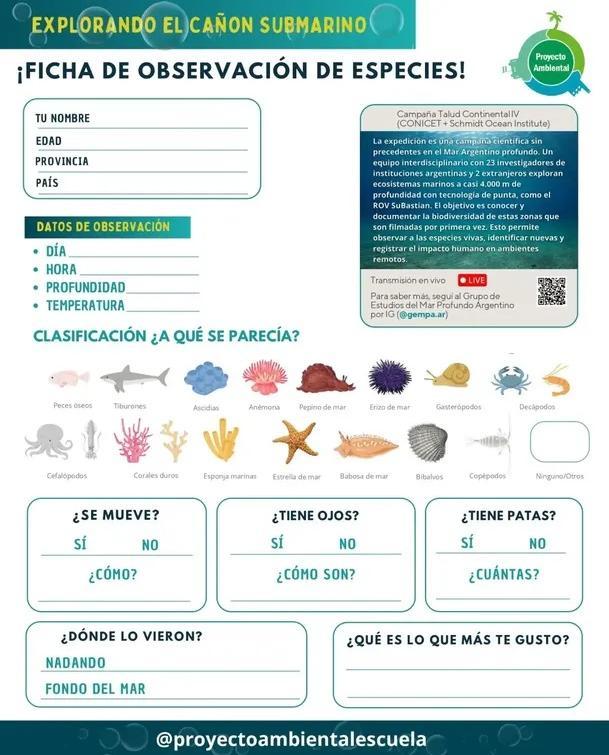 "¡Explorá el fondo del mar en familia! Descargá gratis la ficha educativa 'Observación en el mar' y sumate a esta expedición única al Cañón Submarino del Mar Argentino", promocionaron desde la cuenta oficial del proyecto.