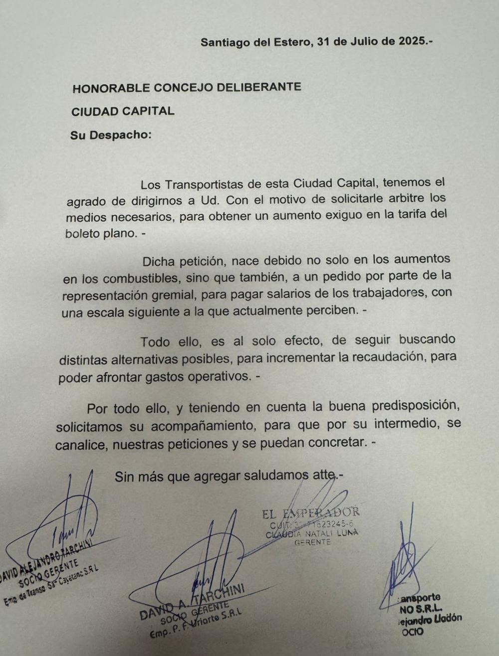 Los empresarios del transporte público urbano de pasajeros de la ciudad Capital solicitaron formalmente un nuevo incremento en la tarifa del boleto plano, argumentando que los actuales valores resultan insuficientes para cubrir los crecientes costos operativos del servicio.