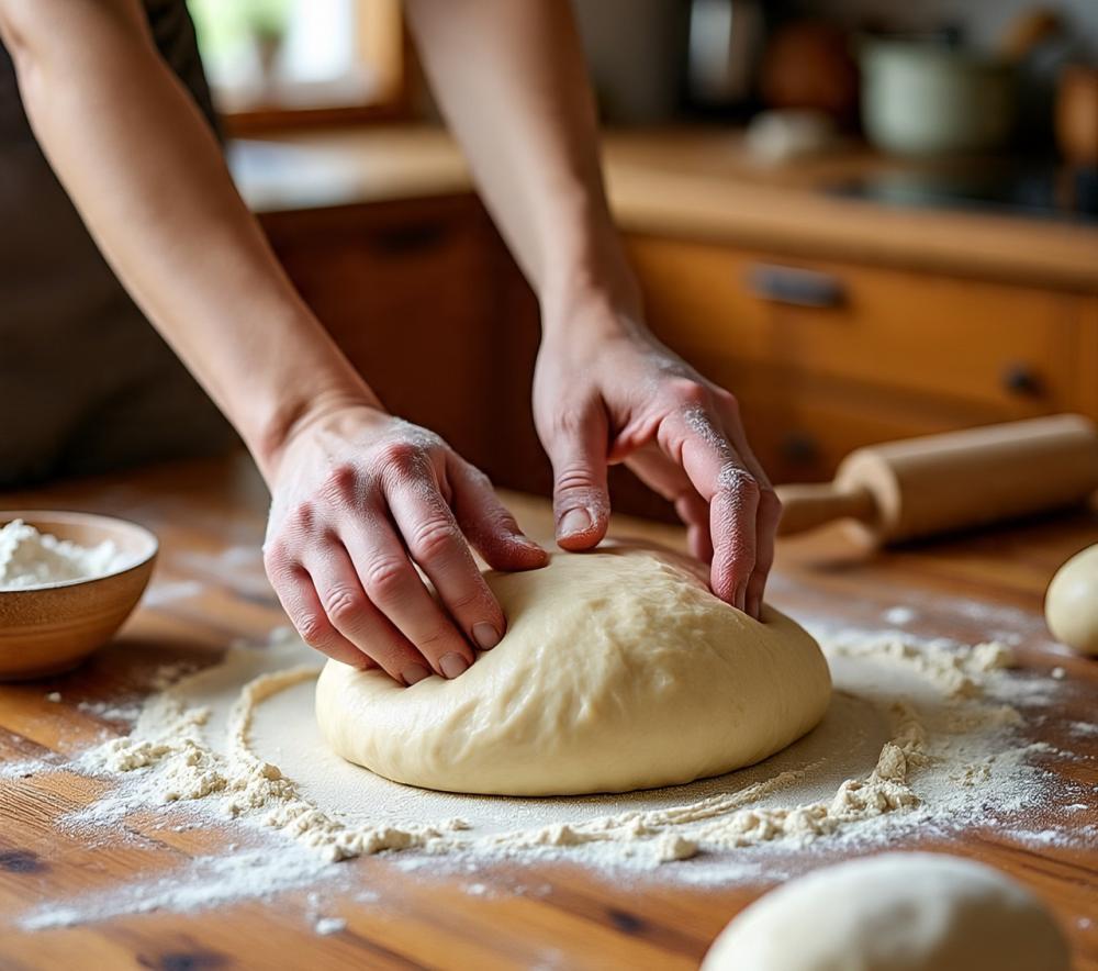 Continúa añadiendo agua y mezcla hasta formar un bollo pegajoso. Luego, amasa con energía hasta que la masa esté suave y elástica.