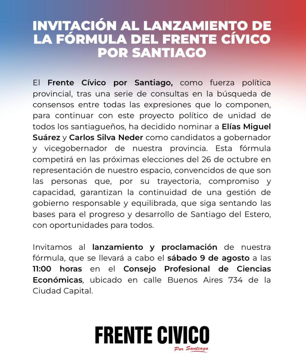 "El Frente Cívico por Santiago, como fuerza política provincial, tras una serie de consultas en la búsqueda de consensos entre todas las expresiones que lo componen, para continuar con este proyecto político de unidad de todos los santiagueños, ha decidido nominar a Elías Miguel Suárez y Carlos Silva Neder como candidatos a gobernador y vicegobernador de nuestra provincia. Esta fórmula competirá en las próximas elecciones del 26 de octubre en representación de nuestro espacio, convencidos de que son las personas que, por su trayectoria, compromiso y capacidad, garantizan la continuidad de una gestión de gobierno responsable y equilibrada, que siga sentando las bases para el progreso y desarrollo de Santiago del Estero, con oportunidades para todos", dice la comunicación oficial.