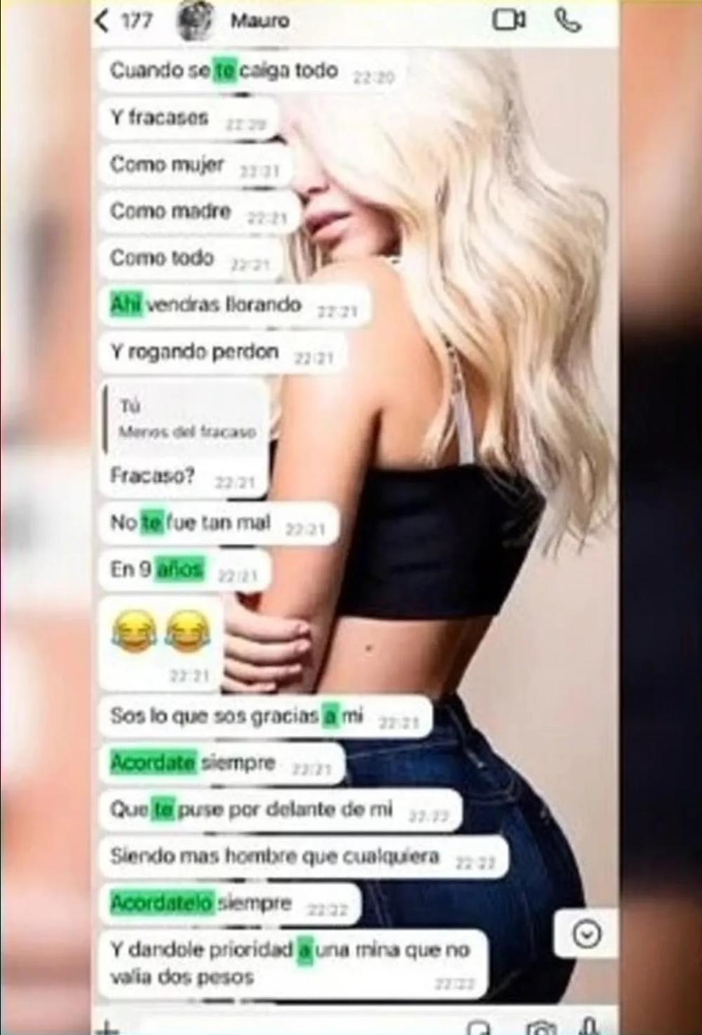 "Cuando se te caiga todo y fracases como mujer, como madre, como todo, ahí vendrás llorando y rogando perdón", le escribió el futbolista. Wanda, irónica, le preguntó a qué "fracaso" se refería. "No te fue tan mal en nueve años. Sos lo que sos gracias a mí. Acordate siempre que te puse por delante de mí", insistió él, recordándole además que según su visión pagó un alto precio en su carrera por su vínculo con ella.