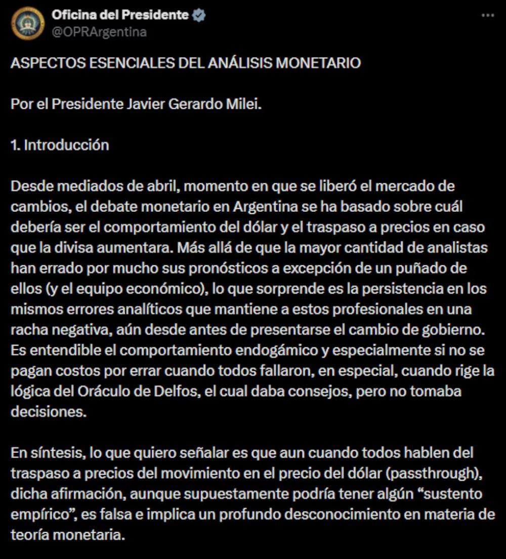 La publicación, titulada "Aspectos esenciales del análisis monetario", se desarrolla en cinco puntos y cita a varios referentes de la llamada Escuela Austríaca y otros teóricos de la economía, como Carl Menger, David Hume, Richard Cantillon, Carl Wicksell y Robert Lucas, autores que Milei ha mencionado en otros discursos y en algunos de sus libros.