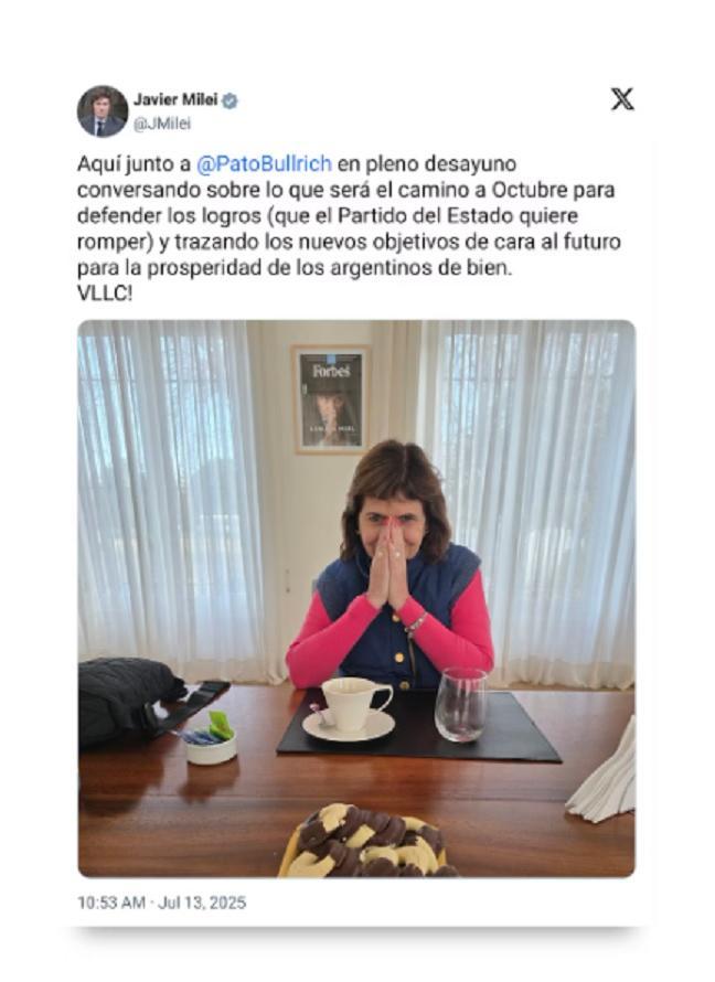 El 13 de julio, Milei ya había dejado una pista clara al publicar una foto junto a Bullrich en pleno desayuno de trabajo, en la que hablaba de "defender los logros" y "trazar nuevos objetivos" para los argentinos.