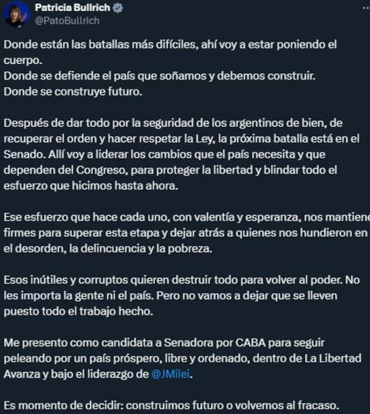 Bullrich cerró su mensaje ratificando su alineamiento con el jefe de Estado: "Bajo el liderazgo de Javier Milei, seré candidata a senadora para seguir peleando por un país próspero, libre y ordenado. Es momento de decidir: construimos futuro o volvemos al fracaso", detalla el portal de Infobae.