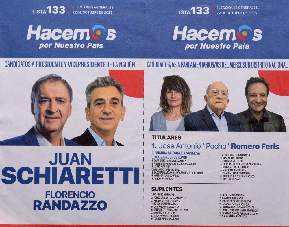 Como se recordará, son cinco las fórmulas a presidente y vicepresidente que participarán en las Generales, con sus respectivas listas de candidatos a parlamentarios del Mercosur distrito único (nacional). Los binomios son: Sergio Massa-Agustín Rossi (Unión por la Patria); Javier Milei-Victoria Villarruel (La Libertad Avanza); Patricia Bullrich-Luis Petri (Juntos por el Cambio); Juan Schiaretti-Florencio Randazzo (Hacemos por Nuestro País); y Myriam Bregman-Nicolás del Caño (Frente de Izquierda y de los Trabajadores-Unidad).