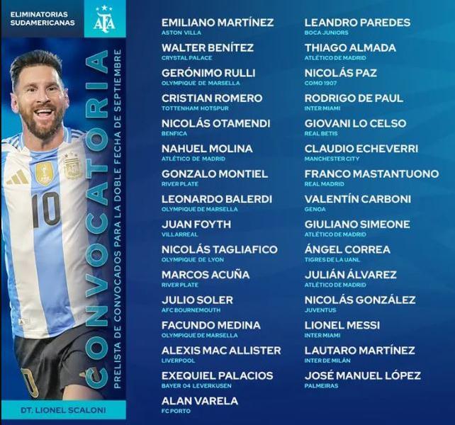 En una citación encabezada por el astro y capitán Lionel Messi, el director técnico argentino convocó a cuatro jugadores que son una novedad en la lista: el defensor Julio Soler del Bournemouth de Inglaterra, Claudio Echeverri del Manchester City, Alan Varela de Porto de Portugal y José Manuel López de Palmeiras de Brasil.