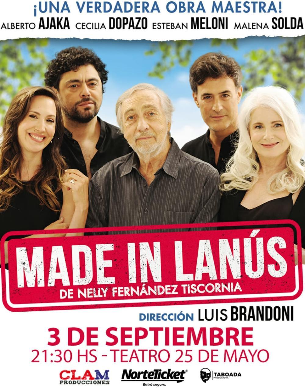 El próximo miércoles 3 de septiembre a las 21:30 en el Teatro 25 de Mayo de la ciudad capital, el público santiagueño podrá disfrutar de "Made in Lanús", una de las obras más emblemáticas del teatro nacional, con dirección de Luis Brandoni y un elenco de lujo integrado por Alberto Ajaka, Cecilia Dopazo, Esteban Meloni y Malena Solda.