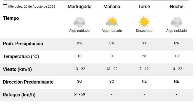 Según los datos del Servicio Meteorológico Nacional (SMN), mañana, tendremos una mínima de 9 °C y una máxima de 23 °C. Durante horas de la madrugada, está previsto que retome el viento con fuertes ráfagas de hasta 59 km/h, pero la intensidad de las mismas cesarán entrada la mañana. Afortunadamente, no hay probabilidades de precipitaciones.