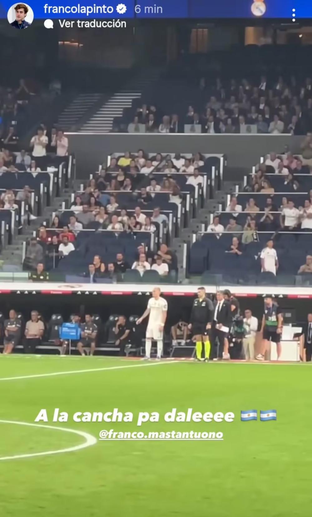 Entre los presentes en el estadio se destacó Franco Colapinto, piloto de Alpine, quien celebró el debut del ex-River con un mensaje en Instagram: "A la cancha, pa. Dale", acompañado de dos emojis de la bandera argentina y una foto de Mastantuono listo para ingresar al campo.
