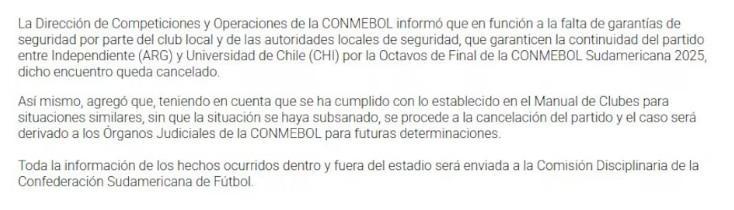 "La Dirección de Competiciones y Operaciones de la CONMEBOL informó que en función a la falta de garantías de seguridad por parte del club local y de las autoridades locales de seguridad, que garanticen la continuidad del partido entre Independiente (ARG) y Universidad de Chile (CHI) por la Octavos de Final de la CONMEBOL Sudamericana 2025, dicho encuentro queda cancelado", comienza el comunicado de la Conmebol.