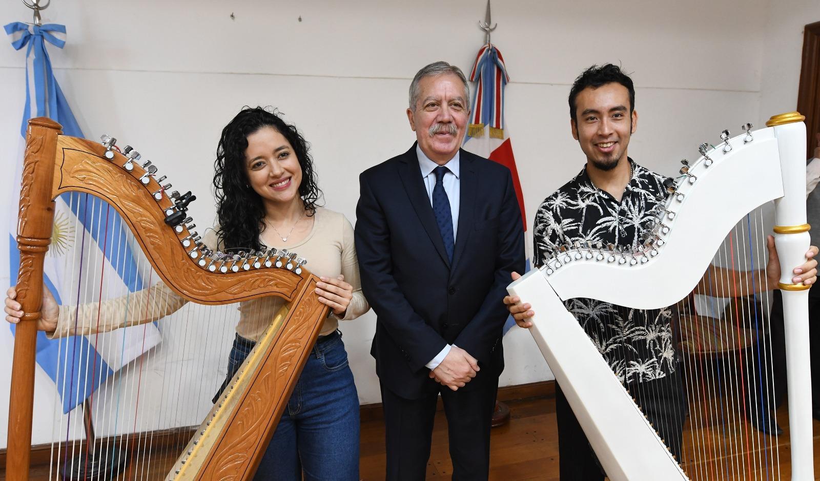 El jefe de Gabinete, Elías Suárez, recibió este jueves por la mañana en Casa de Gobierno a artistas que participarán del 21° Encuentro Latinoamericano Mishquila de Arpas, que se realizará del 20 al 23 de agosto con conciertos en el Centro de Convenciones Fórum y en el Teatro 25 de Mayo.