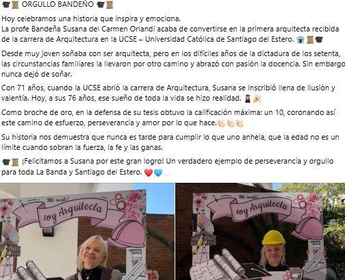 Elegir una carrera, sostenerla, construirla con convicción, reinventarse. La historia de Susana del Carmen Orlandi, una mujer bandeña de 76 años, no conoce de límites, sino de sueños cumplidos. Acaba de convertirse en la primera arquitecta recibida en la carrera de Arquitectura de la Universidad Católica de Santiago del Estero (UCSE). Y su logro no es solo académico: es profundamente humano.