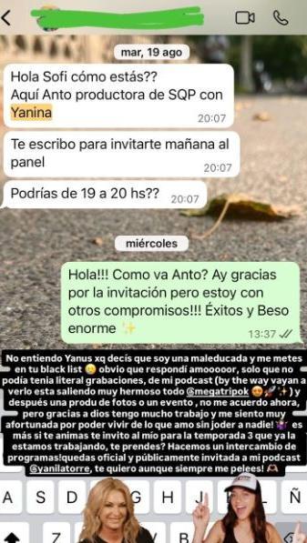 "No entiendo, Yanus, por qué decís que soy una maleducada y me metés en tu lista negra. Respondí con amor, sólo que no podía ir porque tenía mil grabaciones", escribió la modelo.
