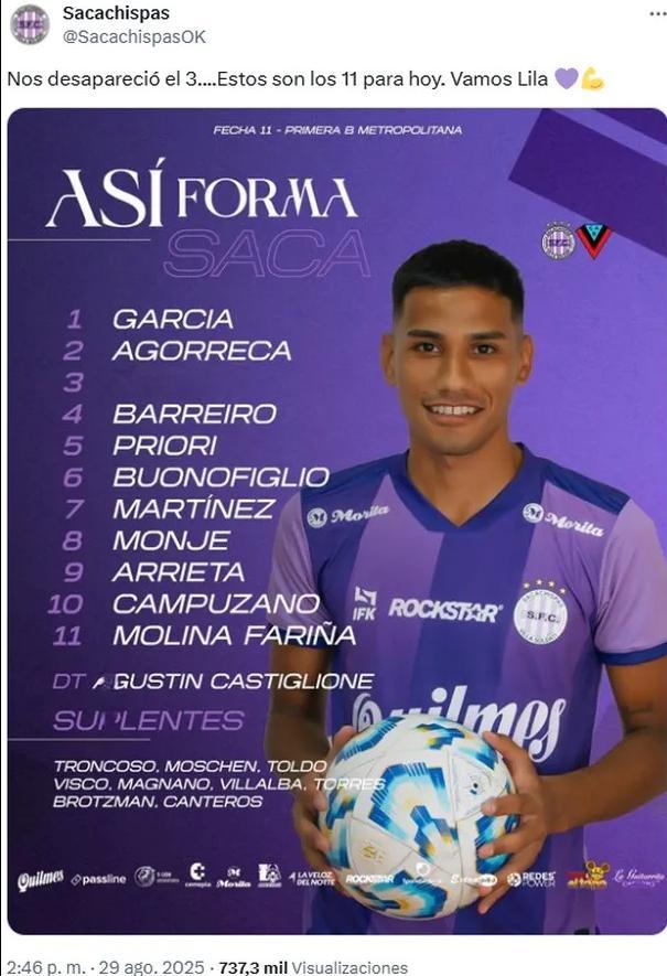 El caso también generó una inesperada reacción en la B Metropolitana: el club Sacachispas se burló del escándalo. En la previa de su partido contra Brown de Adrogué, desde la cuenta oficial del club publicaron la formación titular dejando vacío el tercer puesto, con el mensaje: