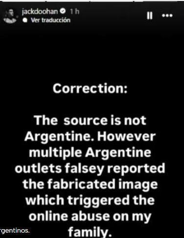 "La historia que circula es completamente falsa. Fue fabricada por fans argentinos que intentan retratarme a mí y a mi familia de forma negativa", dijo primero. Luego, aclaró: "Varios medios argentinos informaron falsamente sobre la imagen fabricada, lo que desencadenó el abuso en línea hacia mi familia".