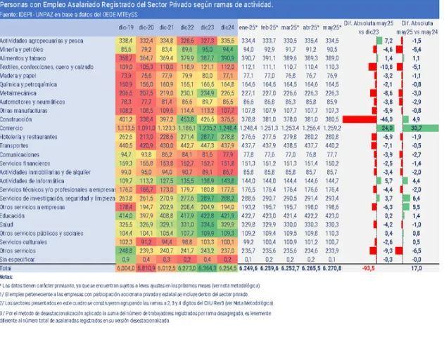 Al final dejamos el resultado del empleo, que arrojan comparando este año contra el anterior y los primeros síntomas de pérdida de empleo en el sector agropecuario y minería se profundizan con la caída siguen automotriz y metalmecánica, la perdida es de 38.000 puestos de trabajo en el sector privado. Comercio e informática siguen siendo los motores de empleo. Si comparamos mayo de 2025 contra diciembre de 2023 la pérdida de puestos de trabajo alcanza los 93.000.