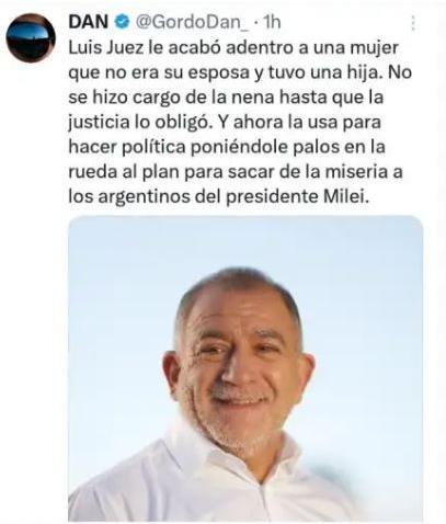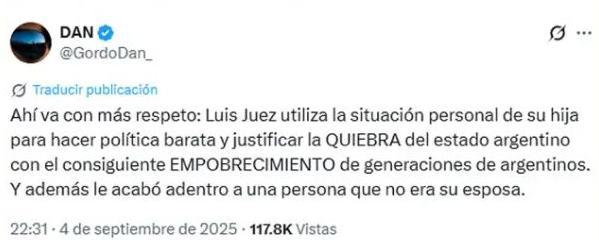 El mensaje original de Daniel Parisini, alias "Gordo Dan", apuntaba a Luis Juez por su voto en contra del veto presidencial a la ley de Emergencia en Discapacidad. Con un lenguaje soez, el influencer criticó al senador cordobés y mencionó a su hija con parálisis cerebral, acusando a Juez de usarla para "hacer política".