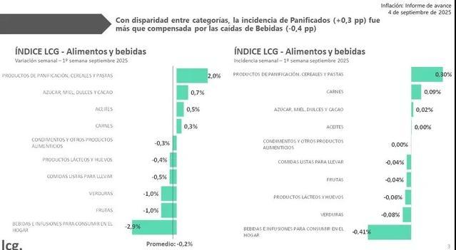 La tendencia refuerza la desaceleración de precios observada en las últimas semanas, lo que sostiene la proyección de las consultoras privadas de una inflación del 1,8% en septiembre para el rubro alimentos y bebidas, menciona el portal Noticias Argentinas.