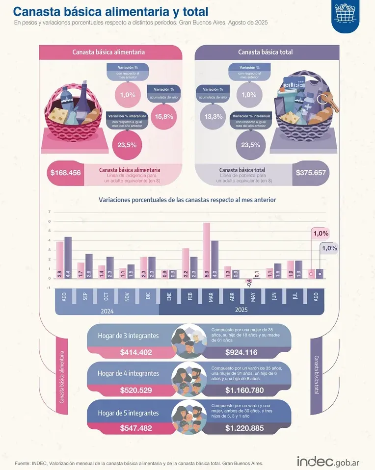 El Instituto Nacional de Estadística y Censos (Indec) dio a conocer que una familia de cuatro integrantes requirió ingresos en agosto por al menos $1.160.780 para no ser pobre, lo que representa un aumento del 1% con respecto al mes anterior y del 23,5% en la comparación interanual. Además, necesitó al menos $520.529 para no caer en la indigencia.