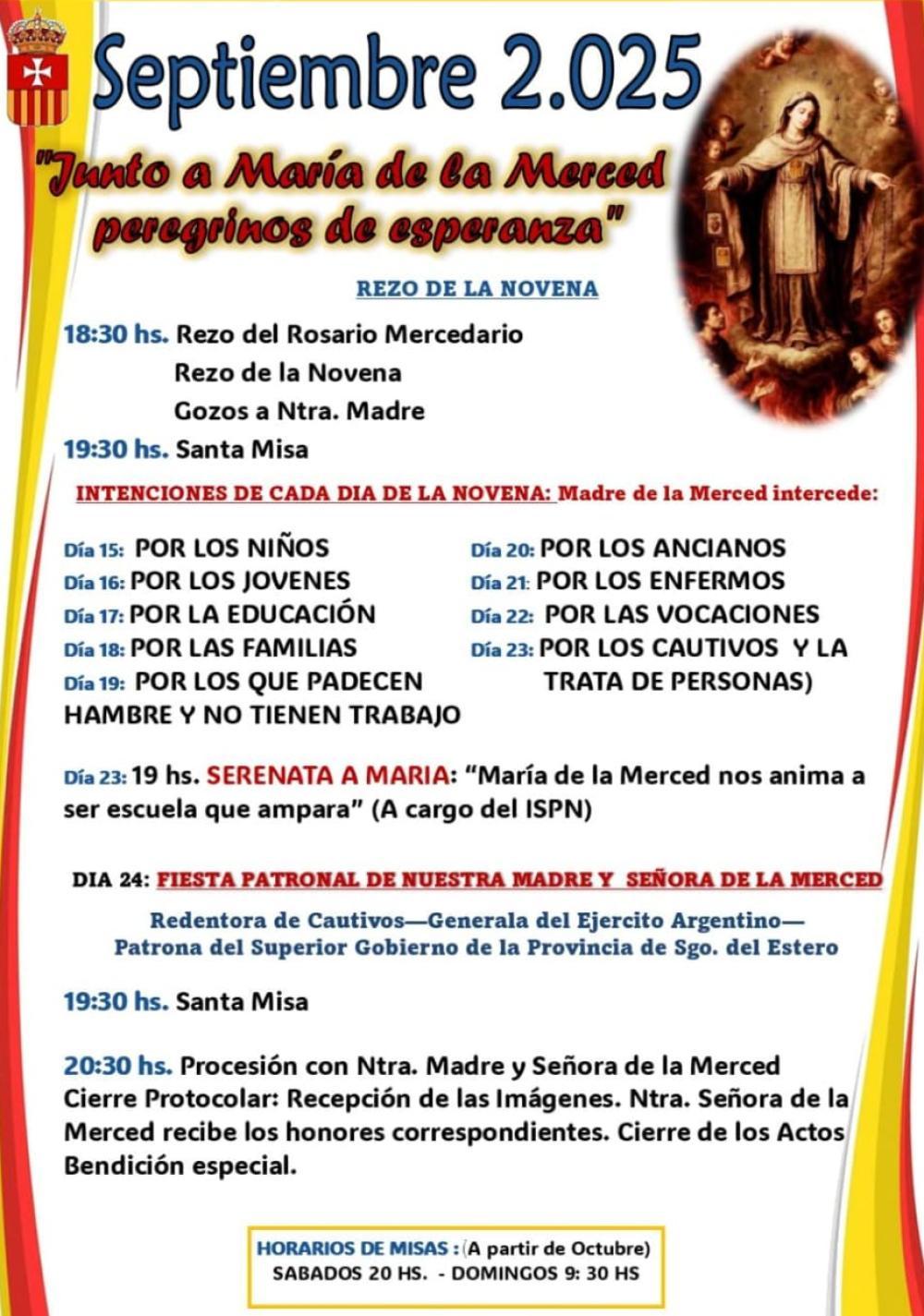 La Parroquia de Nuestra Señora de la Merced invita a la comunidad a participar de las celebraciones de la Novena y Fiesta Patronal, que se desarrollarán durante este mes bajo el lema "Junto a María de la Merced, peregrinos de esperanza".