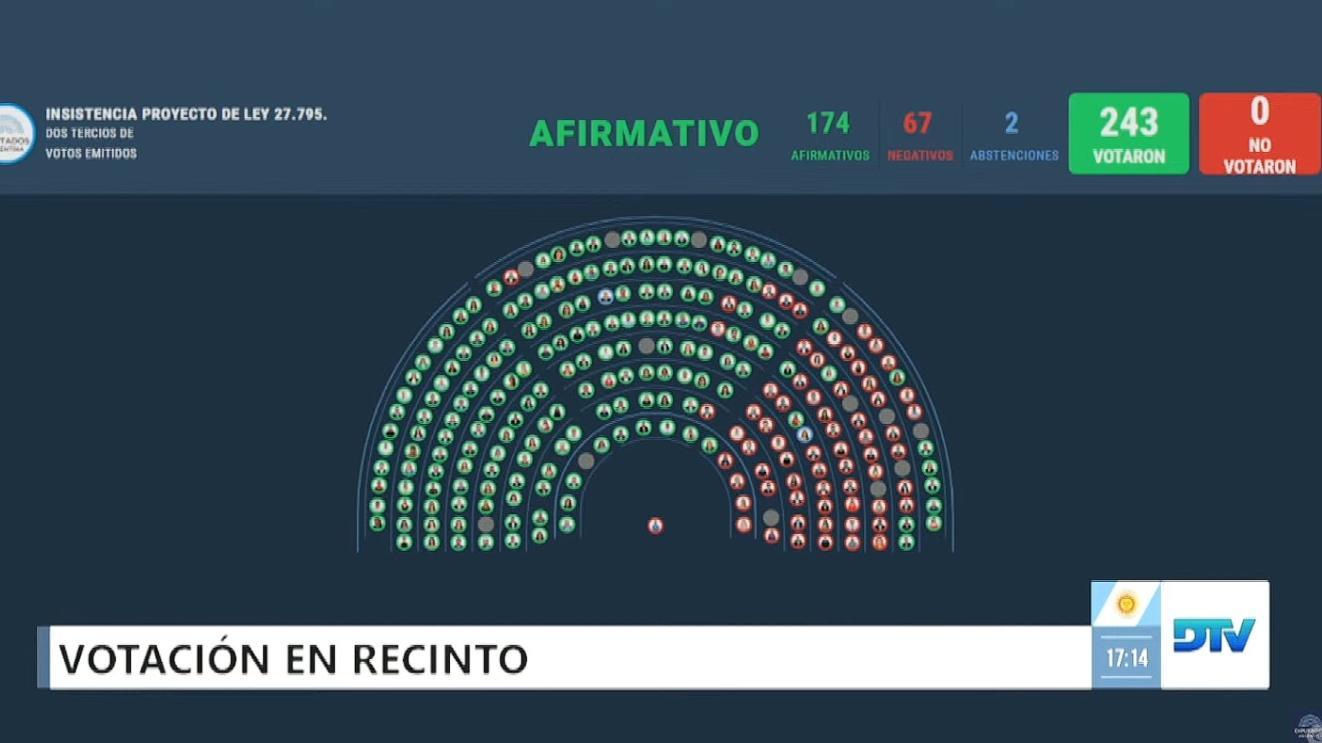 En la misma jornada, también fue rechazado el veto a la ley de Financiamiento Universitario, que garantiza recursos para el sostenimiento de las casas de estudio. La votación resultó con 174 votos positivos, 62 en contra y 2 abstenciones.