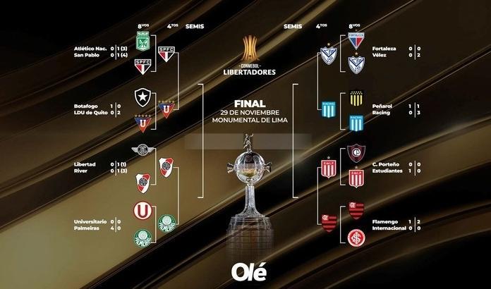Por la otra parte del cuadro, buscan un lugar en la final Racing, Vélez, Estudiantes y Flamengo, todos con el objetivo de llegar al partido decisivo que se disputará en Lima, Perú, el sábado 29 de noviembre.