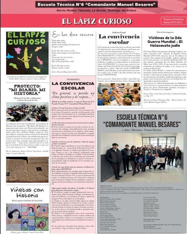 Alumnos de 1.er año de la Escuela Técnica N.º 6 "Comandante Manuel Besares", de la ciudad de la Banda, fueron los ganadores del 3.er concurso de Escritura de Periódicos grupales "De Ana Frank a nuestros días" Centro Ana Frank - Provincia de Santiago del Estero.