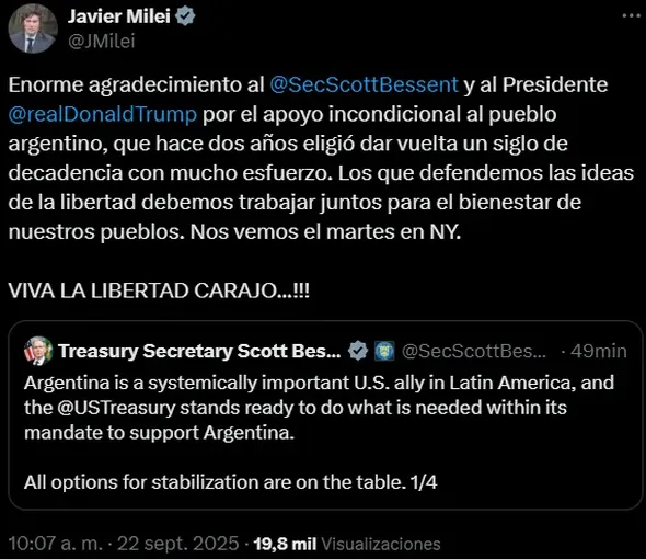 "Enorme agradecimiento al @SecScottBessent y al Presidente @realDonaldTrump por el apoyo incondicional al pueblo argentino, que hace dos años eligió dar vuelta un siglo de decadencia con mucho esfuerzo. Los que defendemos las ideas de la libertad debemos trabajar juntos para el bienestar de nuestros pueblos. Nos vemos el martes en NY. VIVA LA LIBERTAD CARAJO !!!", escribió Milei en su cuenta de X.