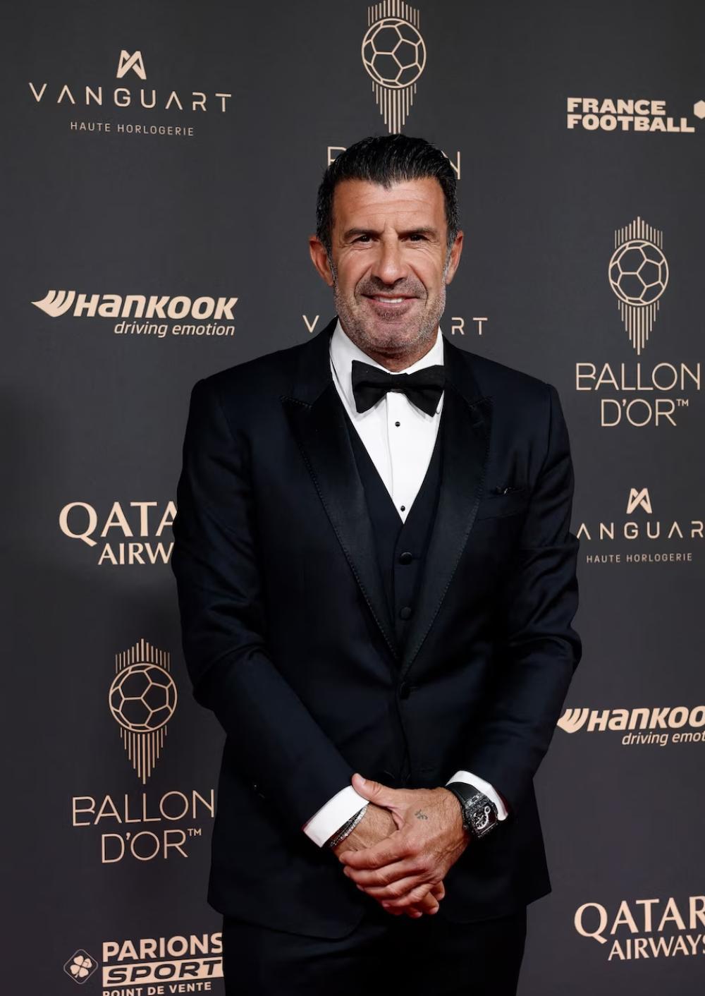 Luís Figo vistió un esmoquin de color negro con solapas satinadas, acompañado de una camisa blanca, chaleco negro y moño a juego. Como accesorio llevó un reloj de pulsera oscuro en la muñeca izquierda.