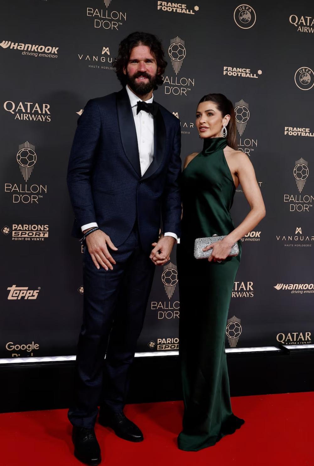 El arquero del Liverpool apostó por un esmoquin azul oscuro con textura, camisa blanca y moño negro.