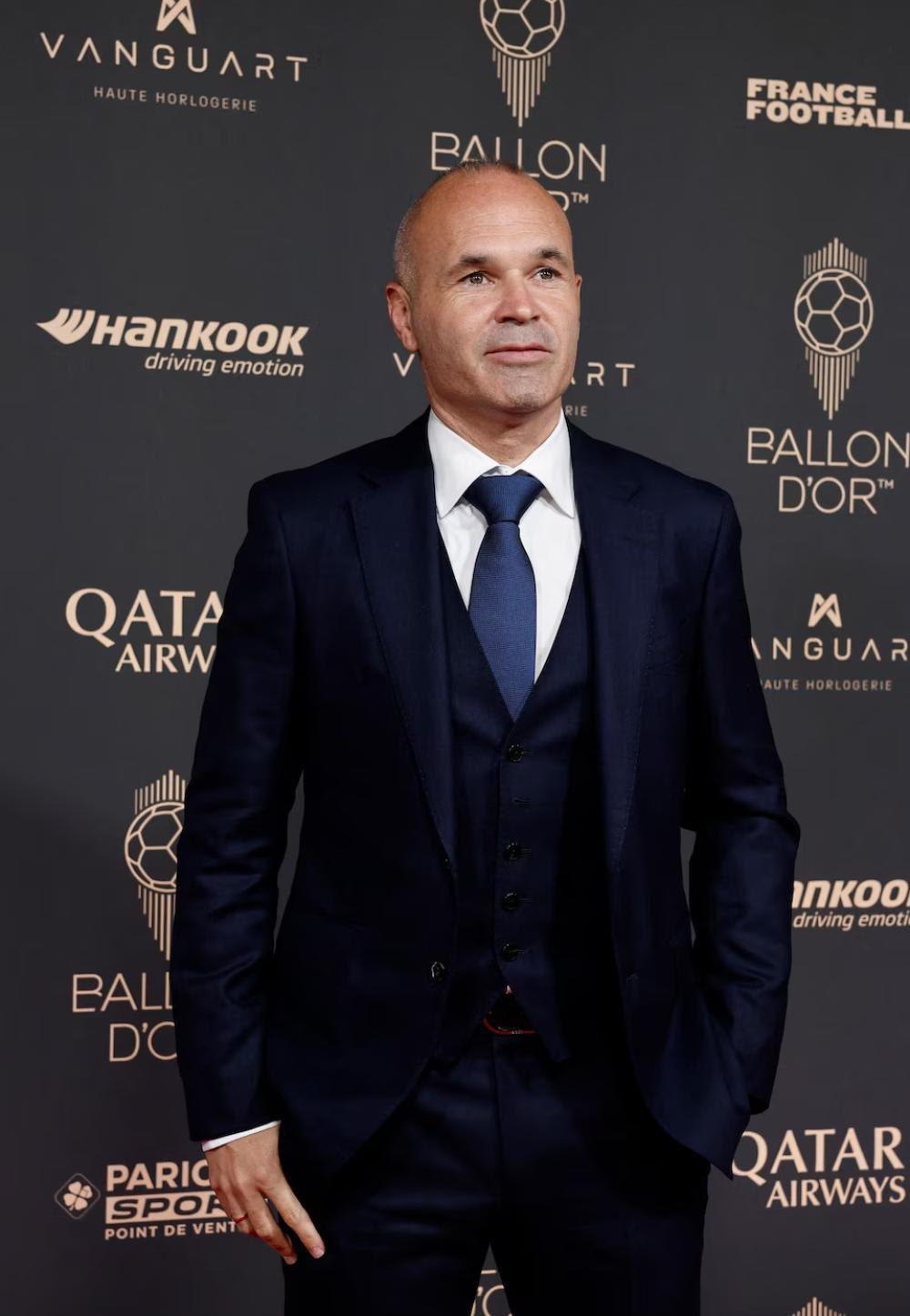 Andrés Iniesta llevó un traje de tres piezas de color azul marino, compuesto por blazer, chaleco y pantalón, acompañado de una camisa blanca y una corbata azul.