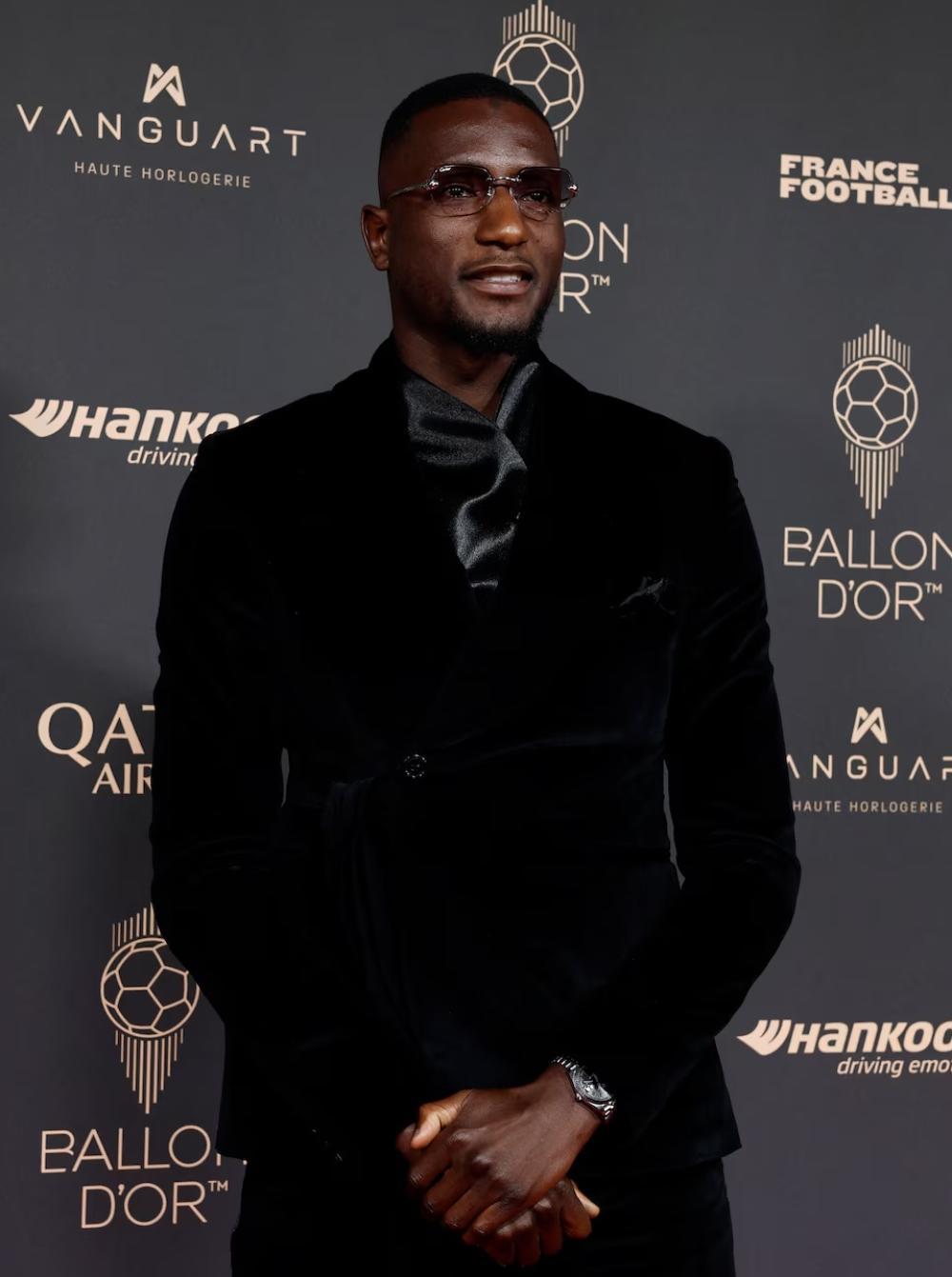 Serhou Guirassy, delantero del Borussia Dortmund y de la selección de Guinea, llevó un esmoquin negro confeccionado en terciopelo, con solapas de raso y camisa negra a juego sin botones visibles.