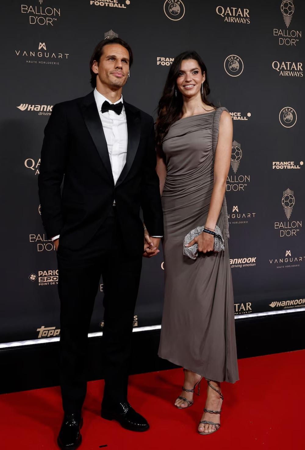 El portero del Inter de Milán optó por un clásico esmoquin negro con moño, mientras que Alina lució un vestido gris drapeado con escote asimétrico, capa ligera y sandalias plateadas.